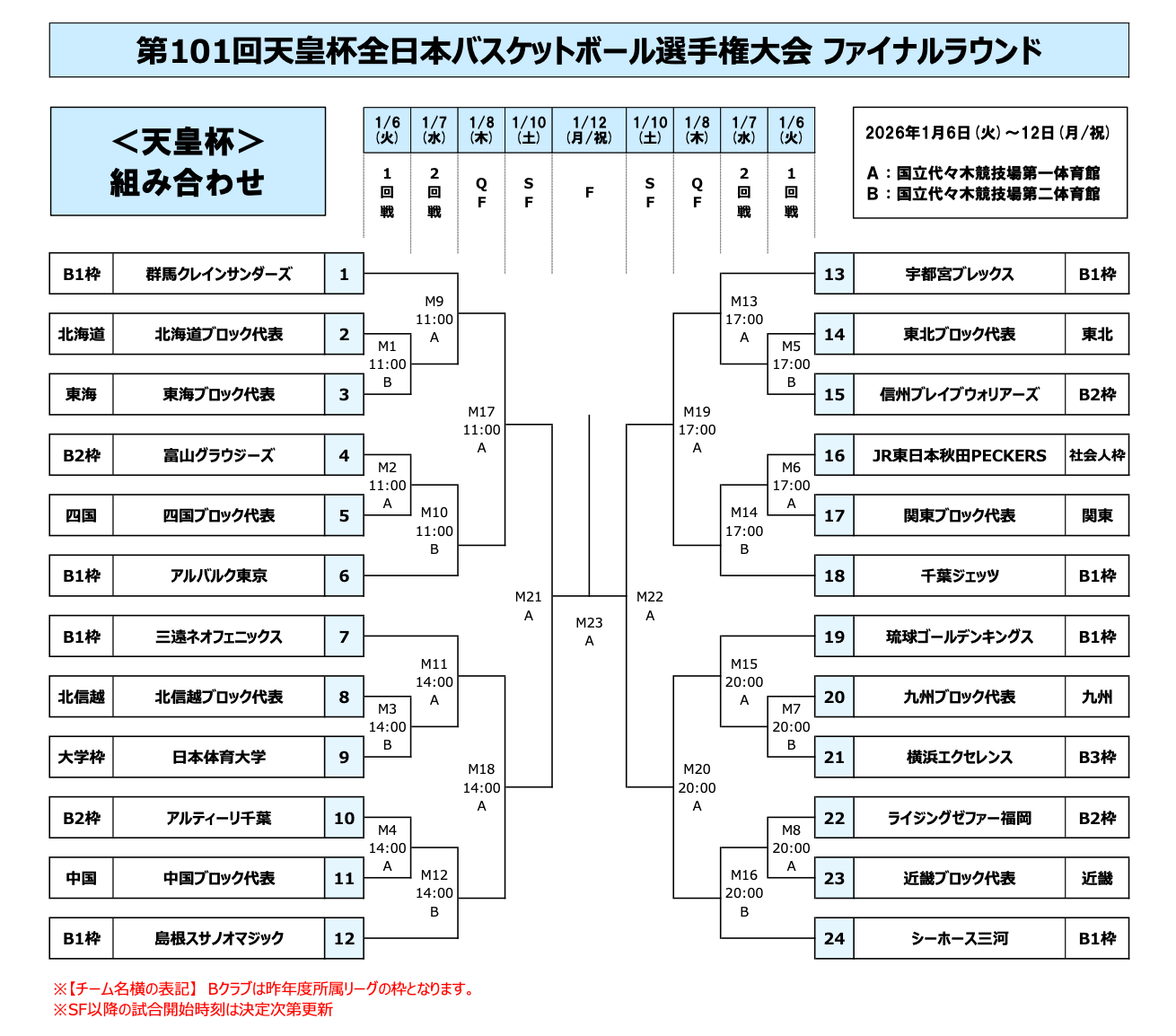 第101回天皇杯・第92回皇后杯 全日本バスケットボール選手権大会 大会実施要項および組み合わせ発表