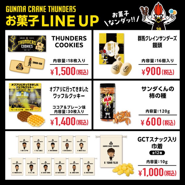 いつも群馬クレインサンダーズへ温かいご声援をいただき誠にありがとうございます。 10月15日(水)レバンガ北海道戦 注目のグッズ情報をお知らせします。 【新商品】 下記4商品は10/29発売予定となります。 【サンダーズガチャ】 サンダーズガチャは14:00~販売開始します。 ▼オンラインショップはこちら オンラインショップ オンラインショップは¥10,000以上のご購入で、送料無料&ステッカープレゼント! ※オンラインショップでは取り扱いのない商品もございます。