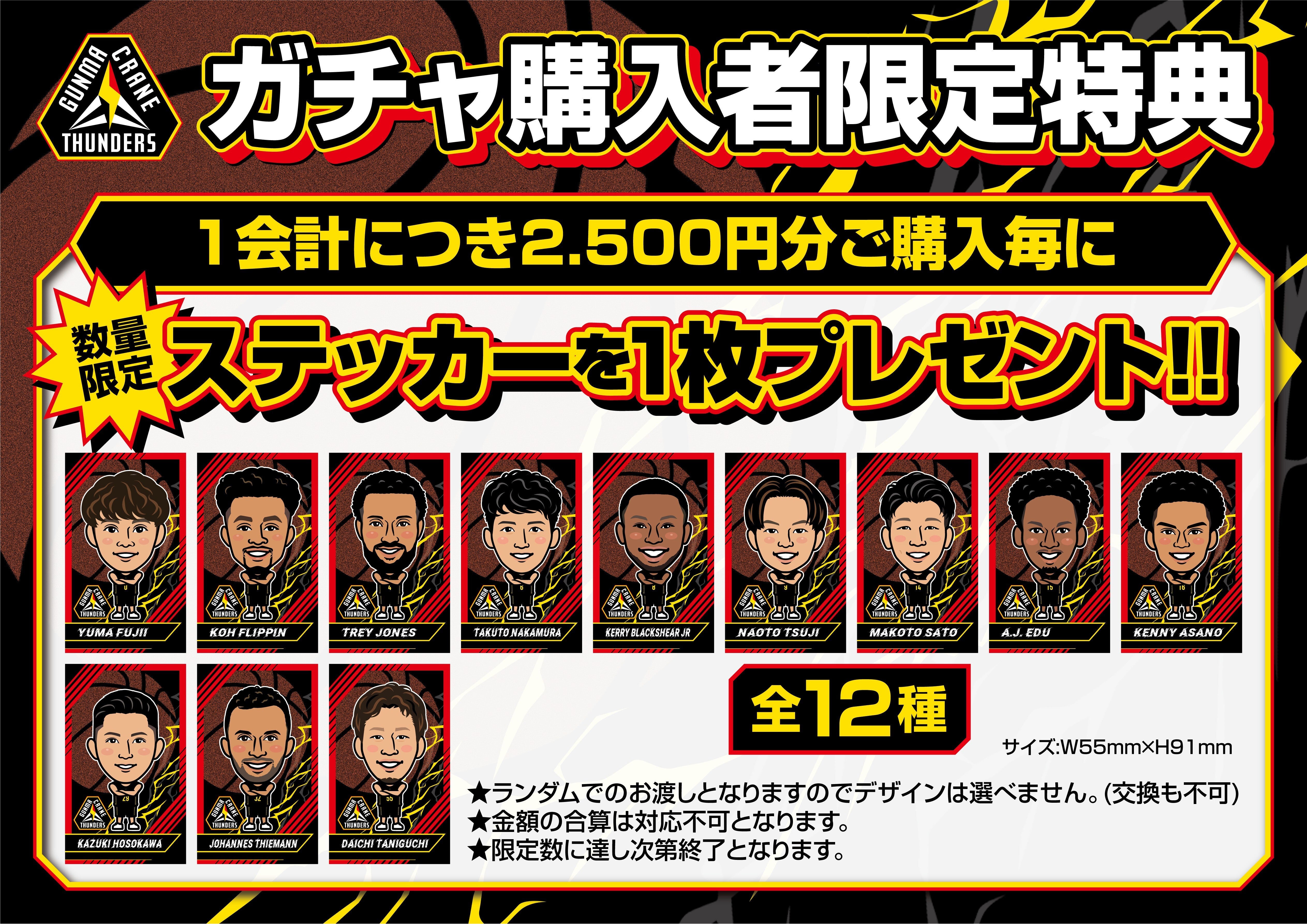 いつも群馬クレインサンダーズへ温かいご声援をいただき誠にありがとうございます。 11月12日(水) 茨城ロボッツ 戦 注目のグッズ情報をお知らせします。 【新商品】 【群馬×茨城コラボグッズ】 【サンダーズガチャ】 サンダーズガチャは14:00~販売開始します。 ▼オンラインショップはこちら オンラインショップ オンラインショップは¥10,000以上のご購入で、送料無料&ステッカープレゼント! ※オンラインショップでは取り扱いのない商品もございます。