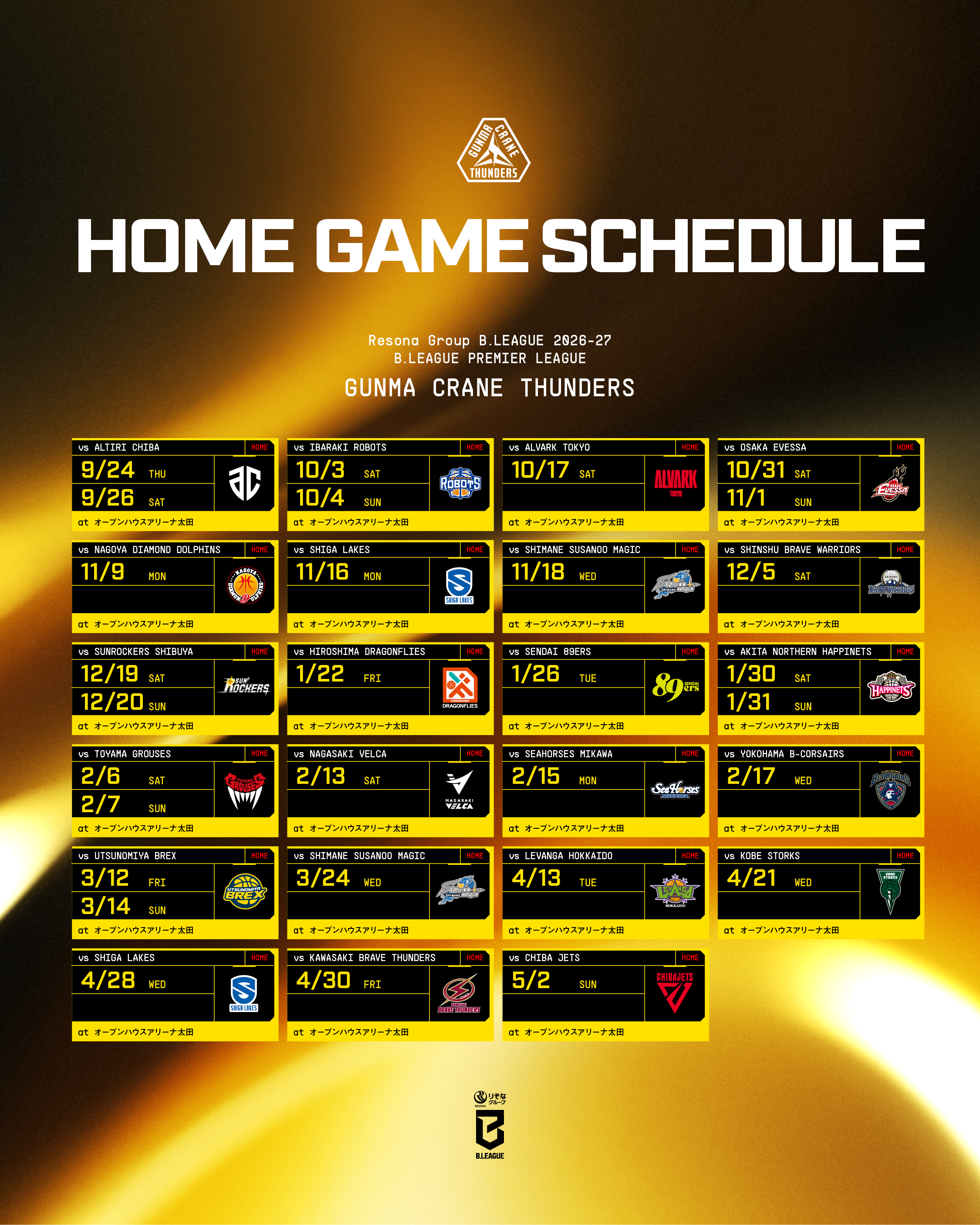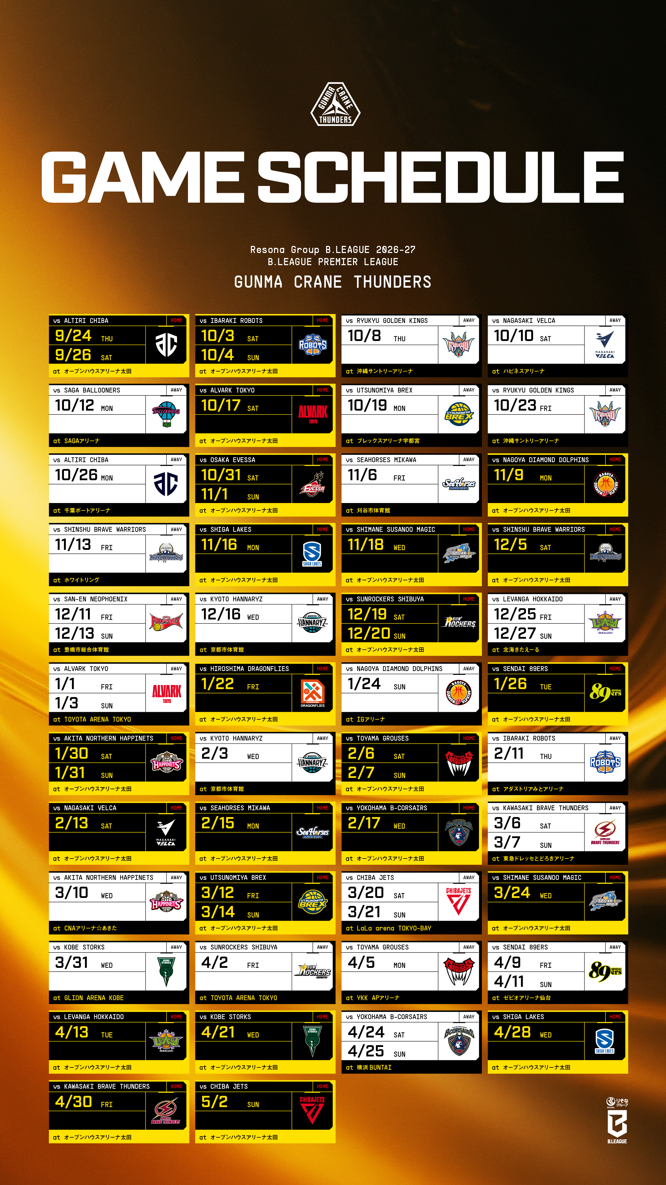 りそなグループ B.LEAGUE 2026-27 B.LEAGUE PREMIER、群馬クレインサンダーズの対戦相手、試合日、試合会場が決まりましたので、お知らせします。